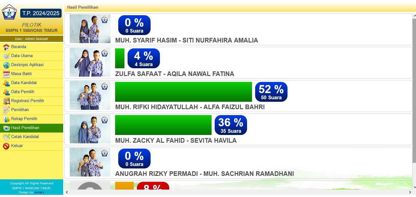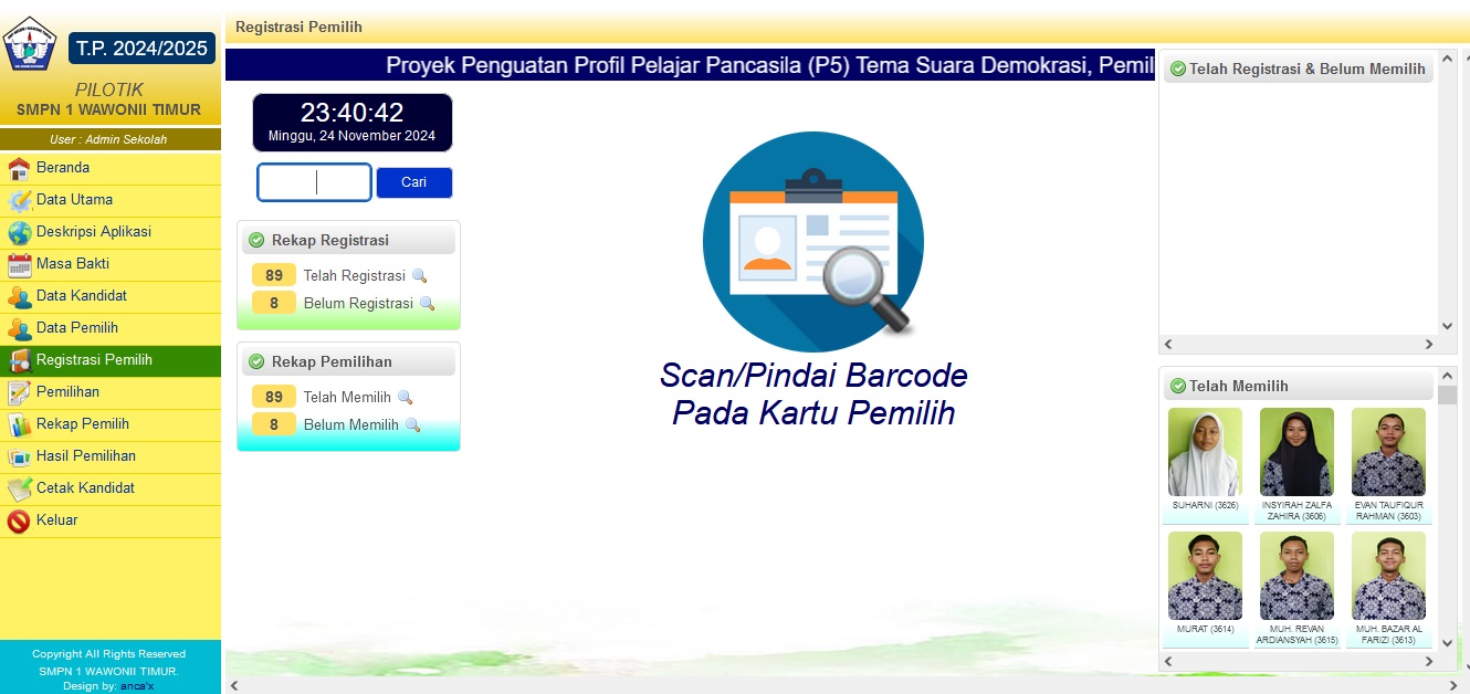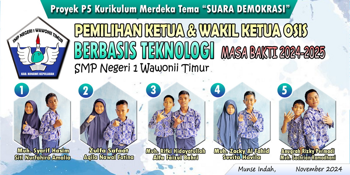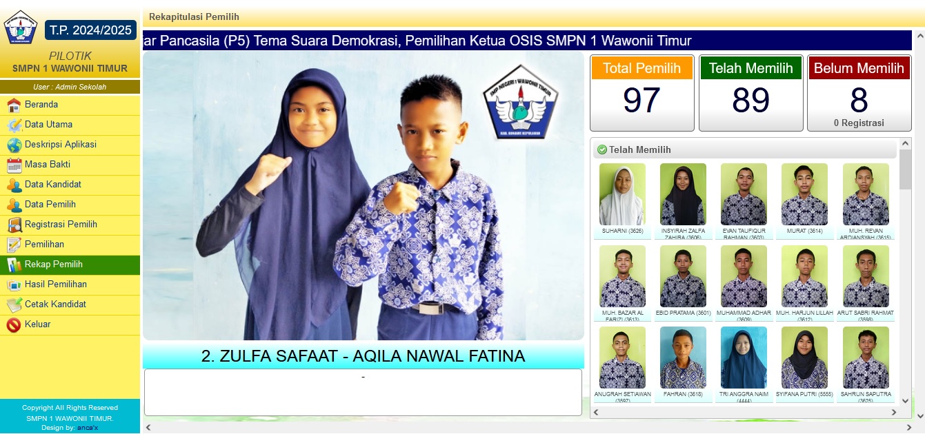 Sabtu, 23 November 2024, SMP Negeri 1 Wawonii Timur Sukses menggelar proyek penguatan profil pelajar pancasila (P5) untuk tema Suara Demokrasi melalui "Pemilihan OSIS Berbasis Teknologi". Kegiatan pemilihan ketua dan wakil ketua OSIS SMP Negeri 1 Wawonii Timur menjadi salah satu Proyek Penguatan Profil Pelajar Pancasila (P5) Kurikulum merdeka untuk tema SUARA DEMOKRASI. Pelaksanaan pemilu OSIS tahun ini berbeda dengan tahun-tahun sebelumnya karena dilaksanakan dengan memanfaatkan peralatan IT berupa 3 buah PC ALL In One, 1 buah laptop, 1 buah LCD dengan alat input 3 buah Barcode Scanner. Foto bersama Kandidat Calon Ketua dan Wakil Ketua OSIS, Guru Pembina dan Kepala Sekolah Aplikasi yang digunakan dalam kegiatan ini adalah aplikasi PILOTIK yang khusus dibuat untuk pelaksanaan pemilihan OSIS di sekolah. Dengan aplikasi PILOTIK, data pemilih dan hasil pemilihan terdokumentasi secara elektronik, jumlah pemilih dan yang belum memilih dapat ditampilkan secara real time, hasil pemilihan langsung dapat dilihat tepat setelah pemilihan usai sehingga kecurangan secara otomatis dapat diantisipasi. Ruang Pemilihan OSIS Registrasi Pemilih dengan cara panitia menscan kartu peserta didik (kartu pemilih) menggunakan Barcode Scanner Jumlah peserta didik SMP Negeri 1 Wawonii Timur sebagai pemilih terdaftar sebanyak 97 orang. Saat pelaksanaan pemilihan, 89 peserta didik menggunakan hak suaranya sedangkan 8 lainnya tidak menggunakan hak suara karena berhalangan hadir. Dalam Pemilihan OSIS tahun ini, terpilih MUHAMMAD RIFKI HIDAYATULLAH dan ALFA FAIZUL BAHRI Sebagai Ketua dan Wakil Ketua OSIS SMPN 1 Wawonii Timur masa bakti 2024/2025. Berikut Tampilan Aplikasi Pemilu OSIS SMP Negeri 1 Wawonii Timur (atm)